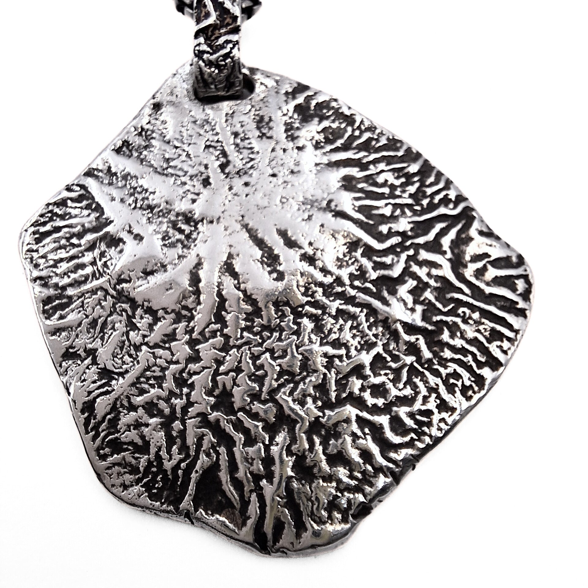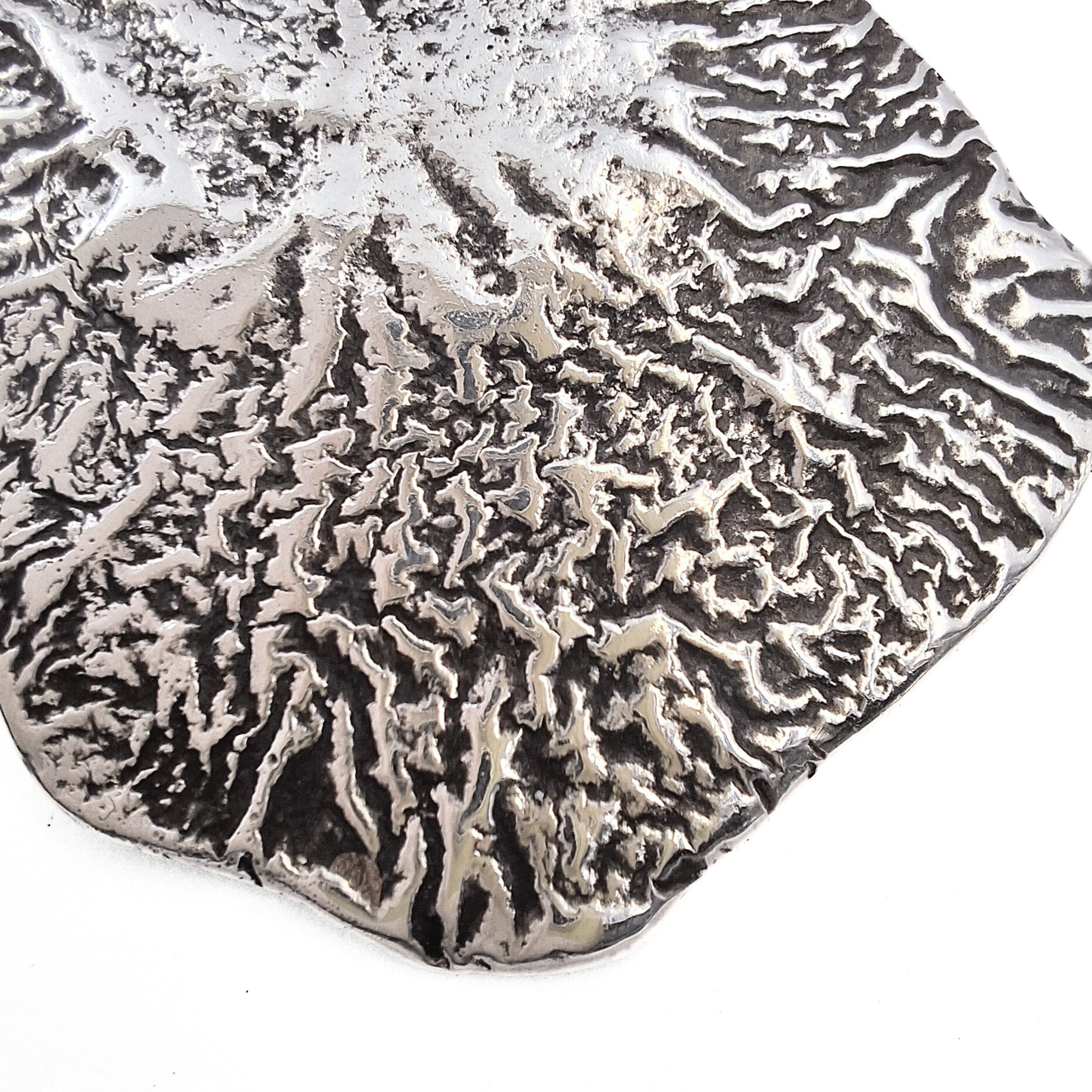 Often when looking at jewelry it's easy to forget that shiny, well crafted metals are of the Earth. These pieces are an aesthetic reminder, bringing echos of valleys, flows, rivulets, and other topographic elements. They are created in a way that's uniquely and specifically working with the metal's physical properties when manipulated through changing conditions. Each one is unique, crafted into a pendant to best highlight their topography when worn.